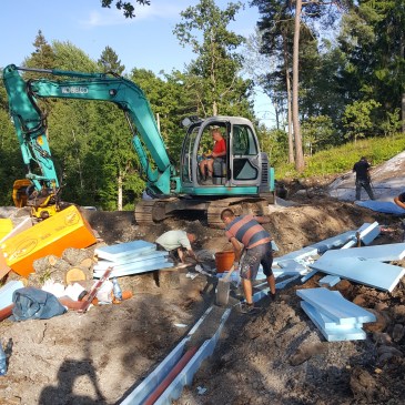 Även markarbeten har kommit i gång. nu ska avlopp, vatten, el-rör m.m ner i marken och en byggväg skapas.