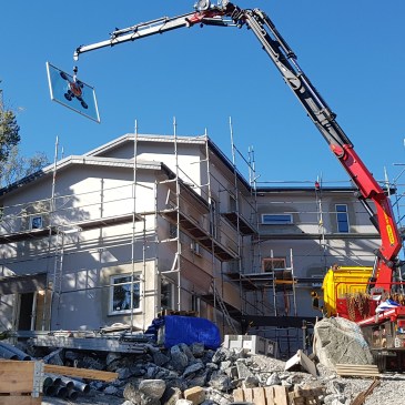Man behöver sen stor kran för att få de stora fönstren till andra sidan av huset.