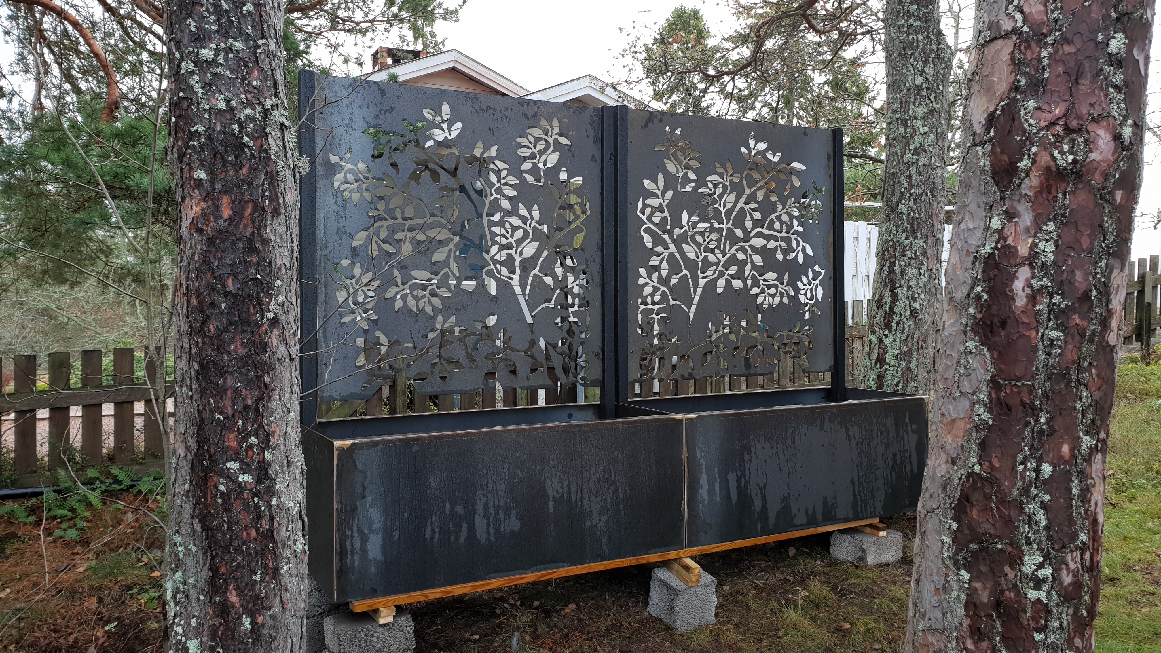 Beställde till slut skärmväggar och blomlådor, mycket velande hit och dit. Vi nu har tillfälligt placerat dem, får nog vänta till våren innan vi bestämmer oss. Denna för att dölja luftvärme pumpen.